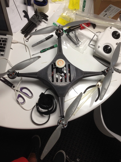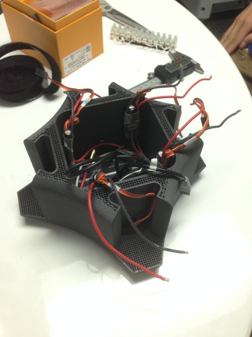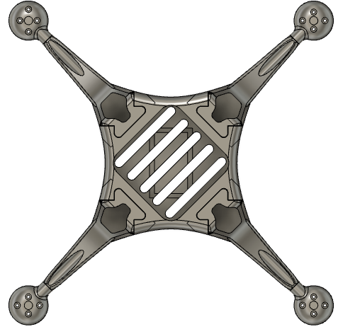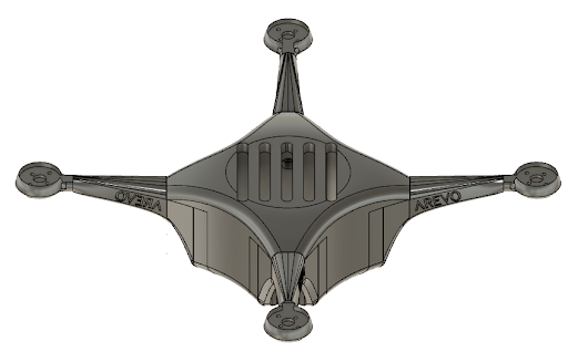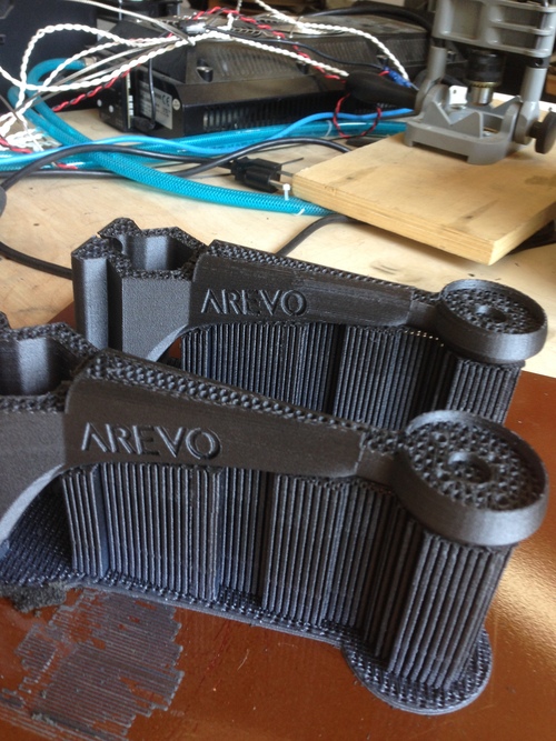 - Printed 5 different pieces: 1 cockpit and 4 arms with 25% infill using 30% carbon fiber Arevo Labs 3-D printing material