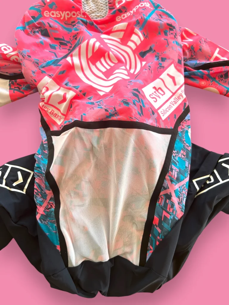 Part of my inspiration for the race number sleeve did come from watching the pros. My favorite team, EF Education – Easy Post, are sponsored by Rapha, and Rapha outfitted them with a Time Trial Suit with a number pocket where the “jersey pockets” would be on a road suit or jersey.