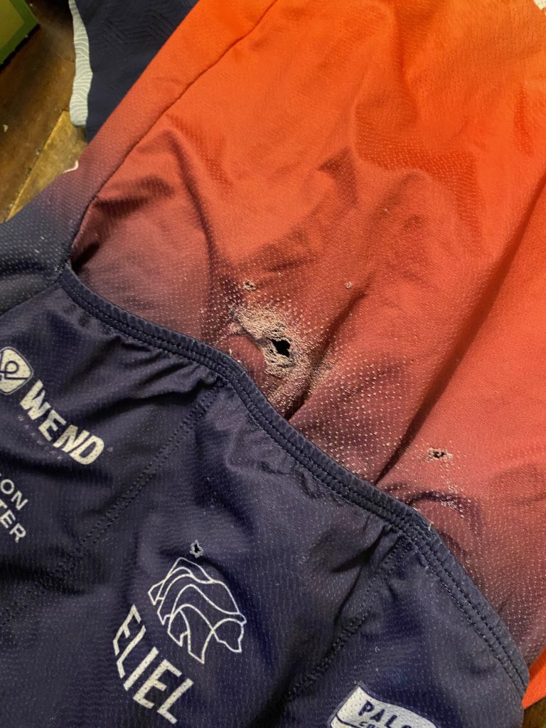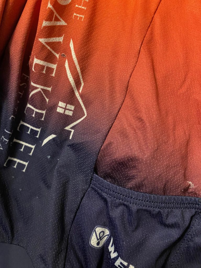 Skin suits are meant to be tight to the skin, and experienced bike racers know the awkwardness of having your teammate pinch your skin suit to try and get a hold of it, usually pinching your ribcage and skin in the process, and then every now and then poking you with the end of the pin before getting it all done. Pins also come undone, numbers and skin suits rip, and you end up doing it all over again or racing with a flapping number. Here is a new skin suit with a few holes in it from racing and an older one that has seen a lot of races and a lot of pins.