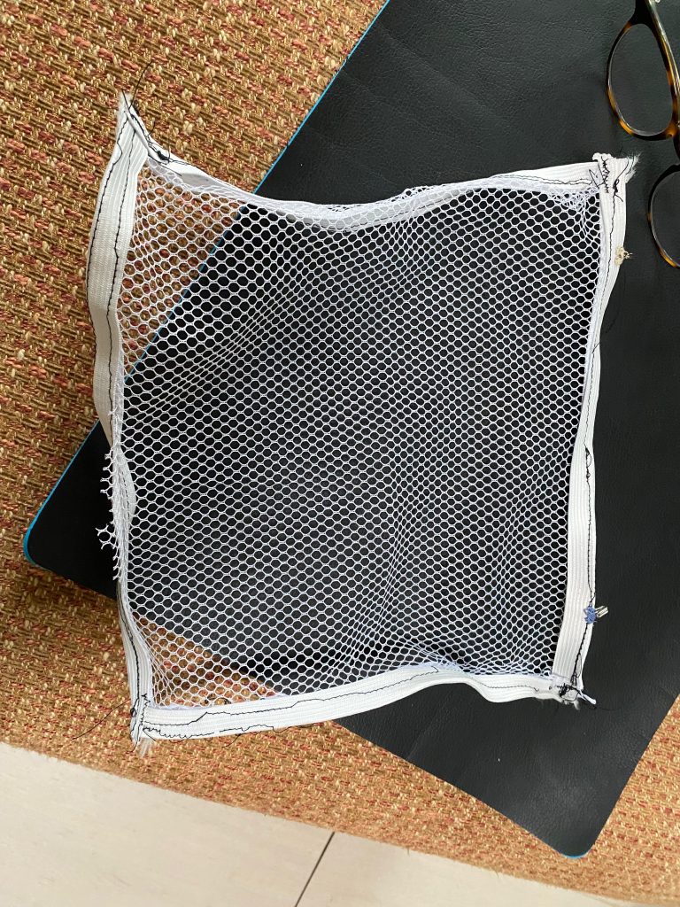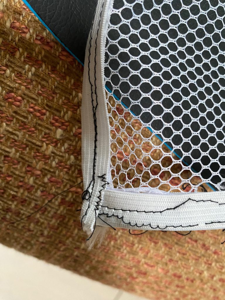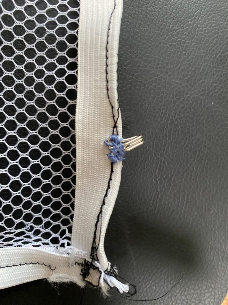 I quickly learned that using the mesh fabric on its own was not satisfactory – the mesh would be pulled non-uniformly at the contact points of the bra hooks / buttons. I decided to sew a more rigid border onto the mesh, emulating other sports garments I’ve seen (on my skin suits in fact) to make the stretch on the mesh more uniform.